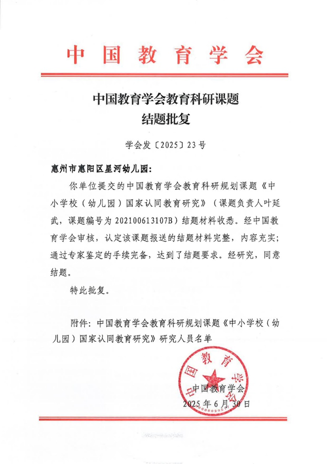 日前,中国教育学会教育科研课题《中小学校(幼儿园)国家认同教育研究》获颁结题证书。历时四年,由k8凯发教育牵头,k8凯发幼儿园以及来自北京、深圳、福州、惠州等城市十余所学校的1万余名师生深度参与、有序推进、成果丰硕。课题组基于国家认同这一核心素养,涵盖幼儿园、小学和中学,结合区域特色构建全新课程;开展教育实践,形成大量一线鲜活案例、专著论文,将抽象的理论概念转化为可操作的教育行为,为粤港澳大湾区以及全国的国家认同教育提供经验探索和实践参考。